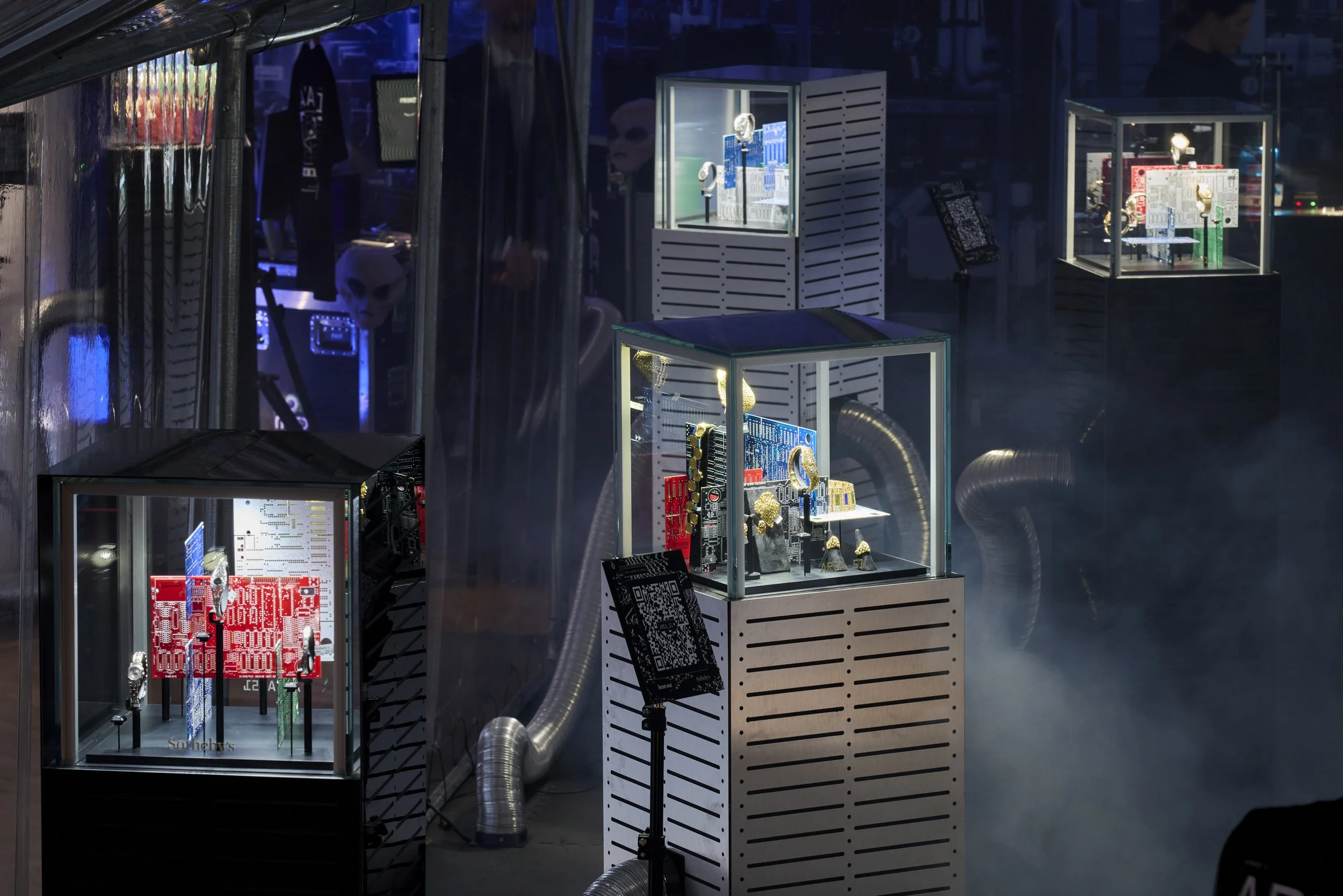 The exhibition scenography was conceived as a secure research zone rather than a traditional display space. Custom-built vitrines, oversized aluminium ducts and controlled smoke effects transformed the venue into a fictional investigation site. The watches appeared as specimens under examination, suspended between science, mystery and design. Every element of the space reinforced the idea of a classified environment, allowing visitors to step inside the AREA_51 narrative and experience the auction as an immersive, spatial extension of the concept.